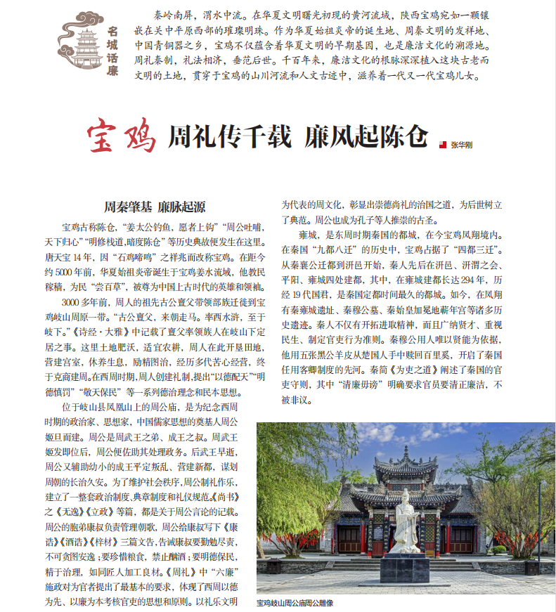 编者按:日前出版的2025年第20期《中国纪检监察》杂志“名城话廉”栏目刊登《周礼传千载 廉风起陈仓》,隆重宣介了宝鸡优秀传统文化和红色革命文化中的廉洁文化,报道了我市深入学习贯彻习近平总书记来宝考察重要讲话精神、加强文物保护和宣传阐释的工作举措,以及新时代廉洁文化建设取得的成效。现全文转载,以飨读者!